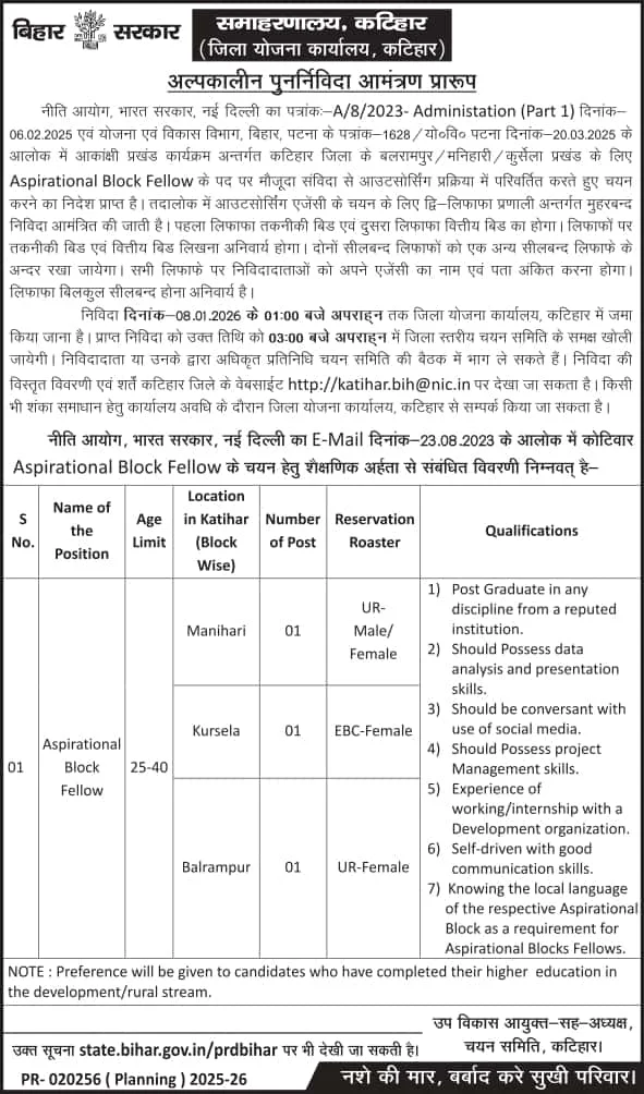 - जिला योजना कार्यालय, कटिहार द्वारा आउटसोर्सिंग निविदा जारी की गई है।