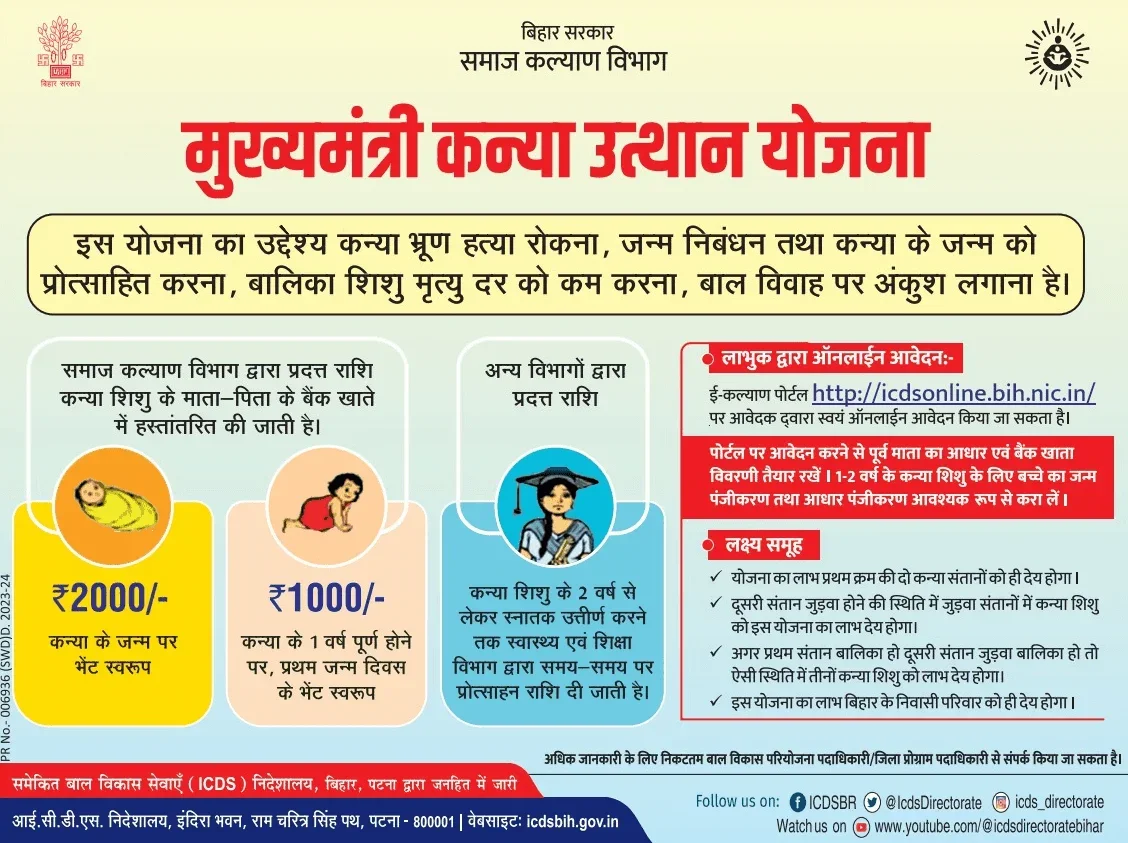 बिहार सरकार द्वारा संचालित मुख्यमंत्री कन्या उत्थान योजना के अंतर्गत राज्य की नवजात बालिकाओं को जन्म से लेकर 2 वर्ष की आयु तक ₹3000 की आर्थिक सहायता दी जाती है। यह राशि दो चरणों में सीधे मां के बैंक खाते में DBT के माध्यम से भेजी जाती है। योजना का उद्देश्य बेटियों के जन्म को प्रोत्साहन देना, बालिका स्वास्थ्य व शिक्षा को बढ़ावा देना तथा समाज में सकारात्मक सोच विकसित करना है।
