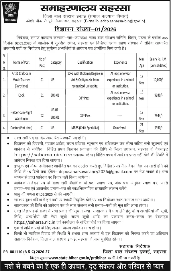 Email ID: dcpusaharsavacancy2026@gmail.com