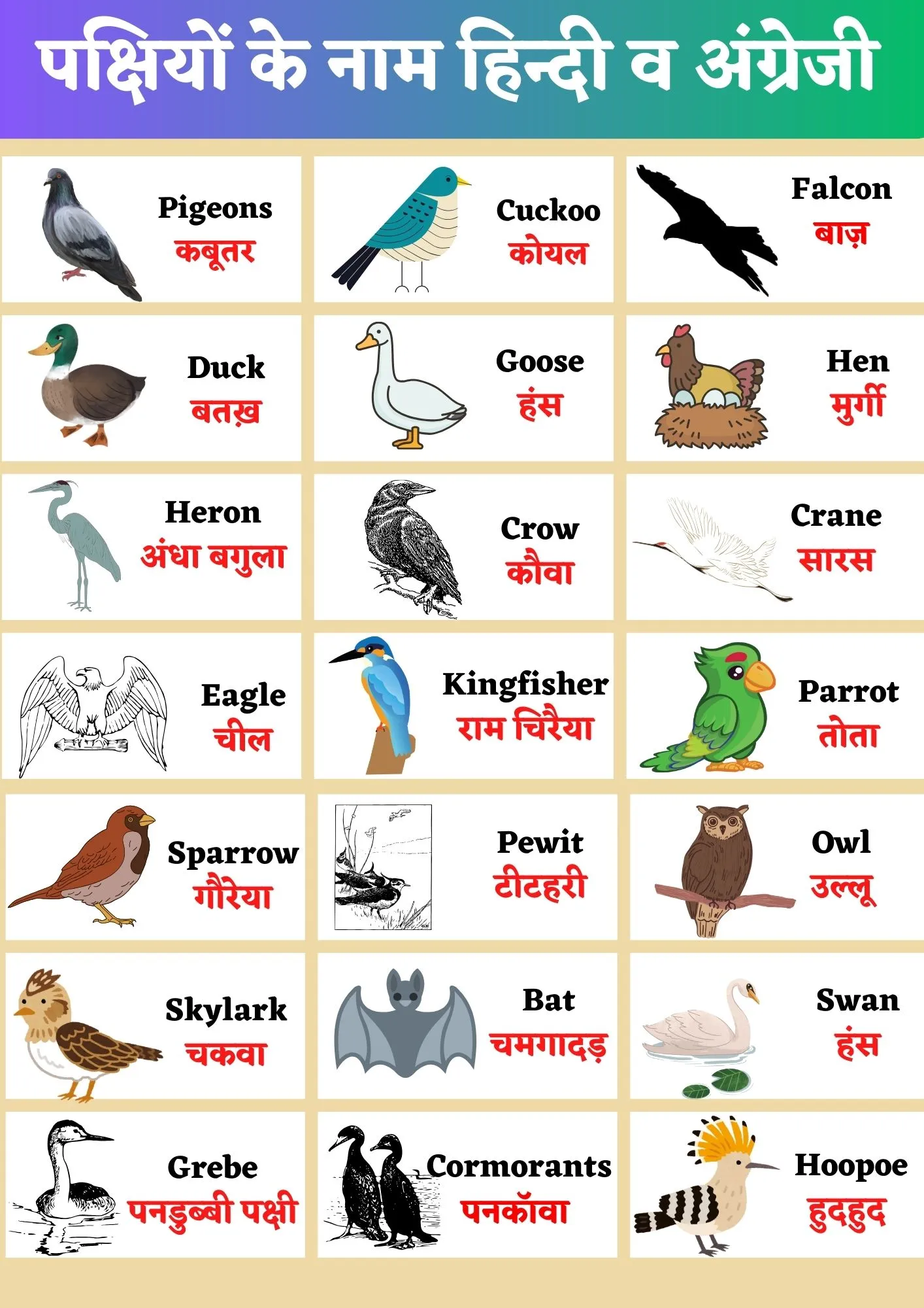 अक्सर छोटे-छोटे बच्चे जो NC, KG, LKG… कक्षा में पढ़ते है उनको सभी पक्षियों का नाम “All Birds Name” जानना बहुत जरूरी है क्योंकि होम वर्क, क्लास वर्क या परीक्षाओं में लिखने को मिलते है लेकिन बहुत सारे छात्रों को 10 से 15 ही पक्षियों का नाम “All Birds Name” याद होते है।