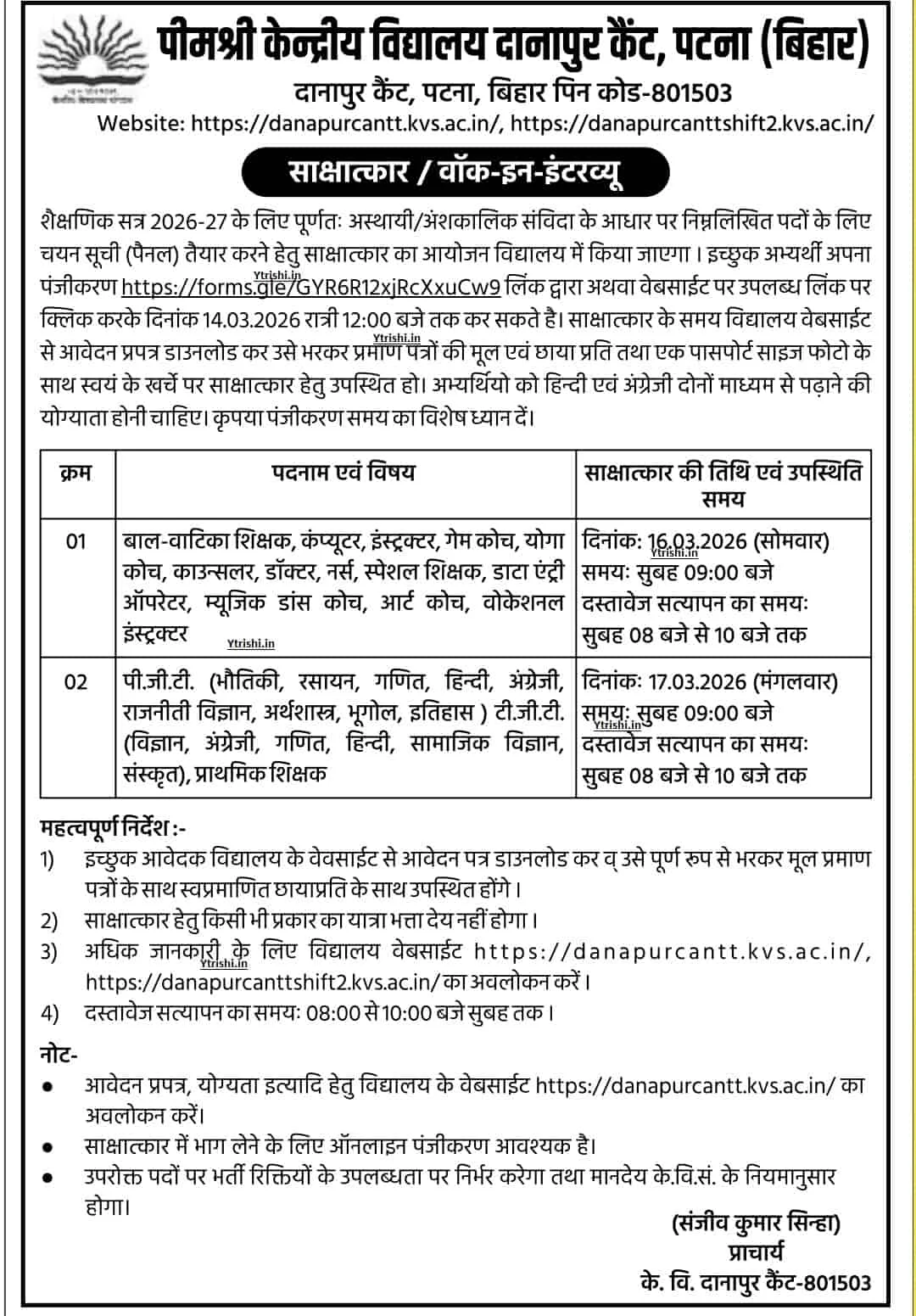 • Walk-in Interview (PGT / TGT / PRT): 17 March 2026