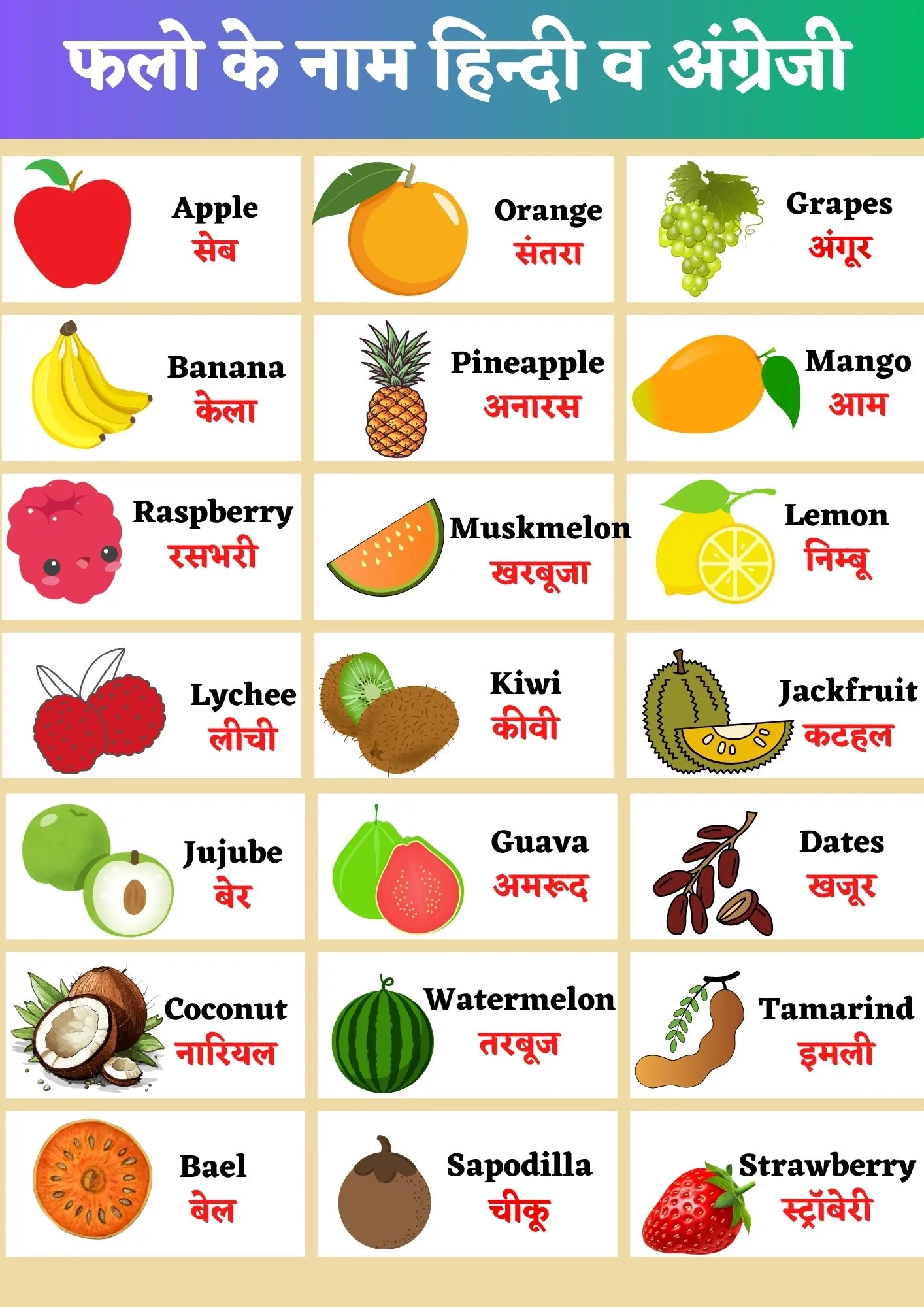 अक्सर छोटे बच्चों जो NC, KG, LKG…में पढ़ते है उनको विद्यालय में Homework तथा Exams में फलों का नाम लिखने को मिलते है लेकिन बहुत सारे ऐसे छात्र है जिनको 10 से 15 ही फलों का नाम याद होता है जिनको आगे चलकर परीक्षाओं में परेशानी का सामना करना पड़ता है।