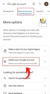 Step-4. क्लिक करने के बाद आपपकों एक पेज खुल जाएगा जिसमे Data and Privacy का ऑप्शन मिलेगा उस पर क्लिक करके Delete your Google Account के ऑप्शन पर क्लिक करे।
