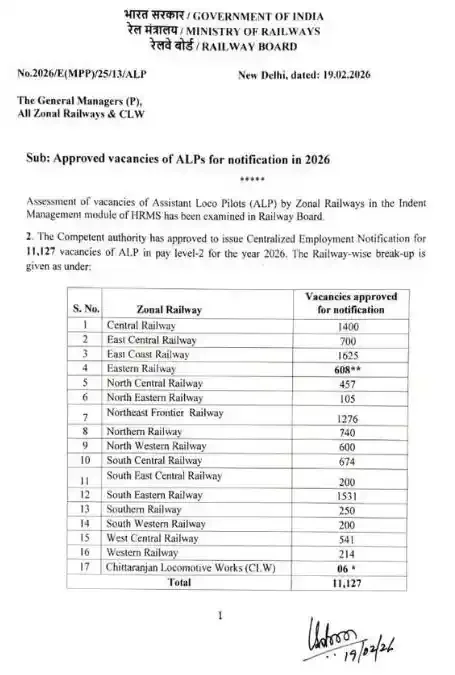भारतीय रेलवे में Assistant Loco Pilot (ALP) के 11,127 पदों पर नई भर्ती प्रक्रिया शुरू होने जा रही है। रेलवे बोर्ड ने 19 फरवरी 2026 को इस भर्ती को मंजूरी दी है। यह भर्ती देश के विभिन्न रेलवे जोन में होगी और ऑनलाइन आवेदन जल्द शुरू होंगे। 10वीं + ITI या डिप्लोमा/इंजीनियरिंग योग्यता वाले उम्मीदवार आवेदन कर सकेंगे।