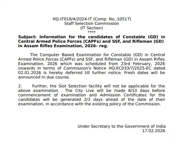 कर्मचारी चयन आयोग (SSC) द्वारा आयोजित GD Constable भर्ती 2026 से जुड़े उम्मीदवारों के लिए महत्वपूर्ण अपडेट जारी हुआ है। पहले 23 फरवरी 2026 से प्रस्तावित परीक्षा फिलहाल स्थगित कर दी गई है और नई परीक्षा तिथि जल्द घोषित होगी। एडमिट कार्ड परीक्षा से कुछ दिन पहले जारी किया जाएगा। इस लेख में आप SSC GD Admit Card, परीक्षा तिथि, सेंटर, चयन प्रक्रिया और डाउनलोड प्रक्रिया की पूरी जानकारी सरल हिंदी में जानेंगे।