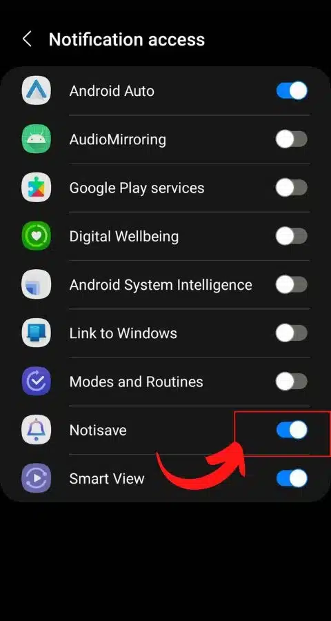 Step-5. यहाँ आपको Notification access करने के लिए Notisave App को एनेबल कर दे और फिर Allow के ऑप्शन पर क्लिक करें और एक स्टेप पीछे आयें।